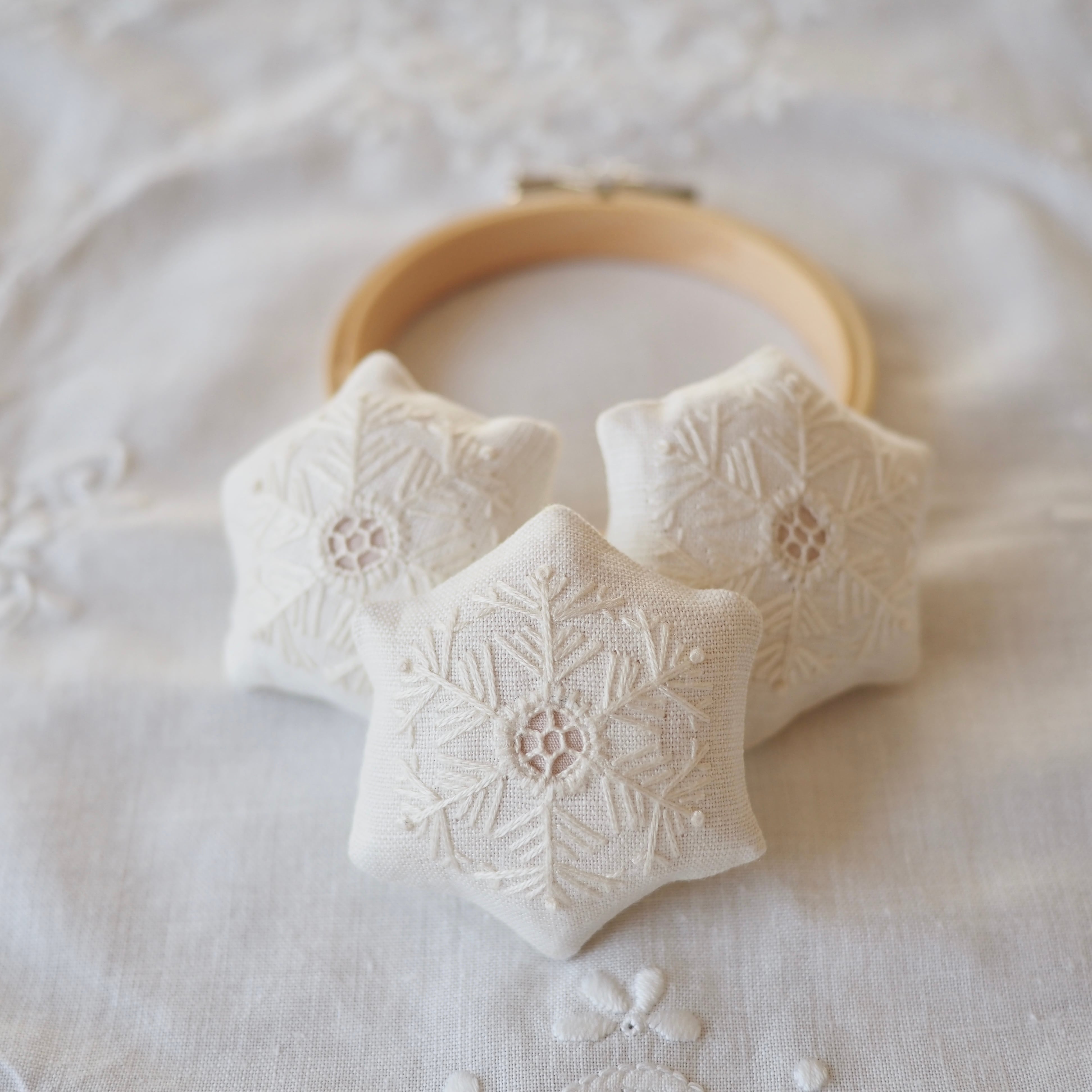 うっすら生成がかった白いリネン生地に雪の結晶を1つずつ丁寧に手刺繍し、ちいさなクッションに仕立てました。